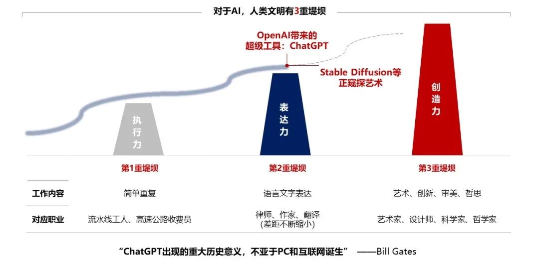 洪潮早已漫过第一重堤坝,名为执行力。AI替代了简单重复的工作,如流水线工人、高速公路收费员。第一道堤坝使用一些RPA等技术也可实现,加持GPT后将更具竞争力,简单重复的劳动被ALL in替代将是必然的趋势。
