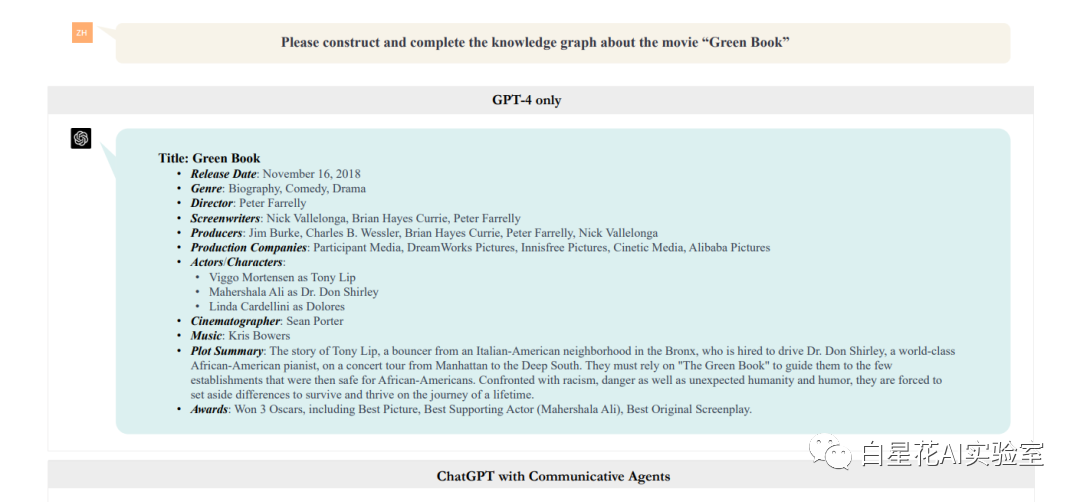 在这个实验中,我们使用了CAMEL(Li等人,2023)中的角色扮演方法。如图6所示,AI助手被指定为顾问,AI用户被指定为知识图谱领域专家。在收到提示和指定的角色分配后,任务指定代理提供详细的描述以具体化概念。在此之后,AI助手和AI用户在多方设置中协作完成指定的任务,直到AI用户确认其完成。实验示例表明,使用多代理方法,与电影《绿皮书》相关的知识图谱被更有效、更全面地构建。这个结果也强调了基于LLM的代理在构建和完成知识图谱方面的优越性。
