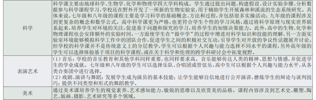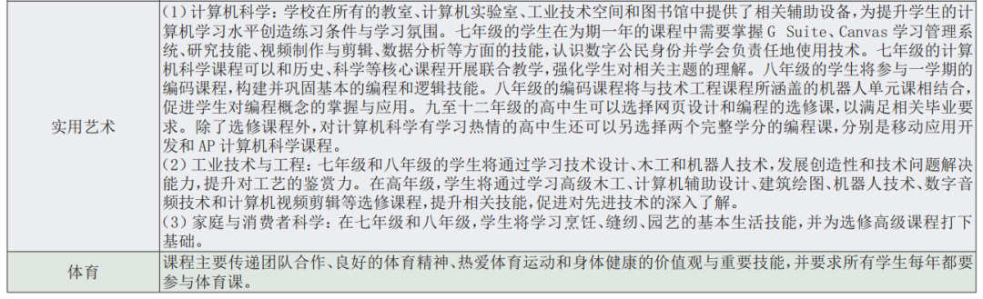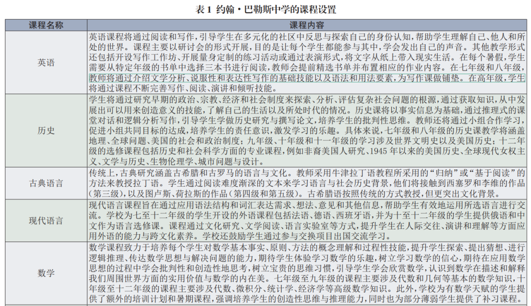约翰•巴勒斯中学建构了一个非常细致和完整的课程体系(见P18表1),主要涉及英语、历史、古典语言、现代语言、数学、科学、表演艺术、美术、实用艺术、体育等学科,为学生挑选兼顾升学要求和个人兴趣及能力的课程提供了非常大的空间。这些课程的设计理念面向培养全面发展的现代学生的教育目标,与大学的博雅教育之间相互贯通,旨在引导学生学会思考、学会生活、学会表达、学会交往,发挥课程教学在学生成长与发展过程中的关键作用。
