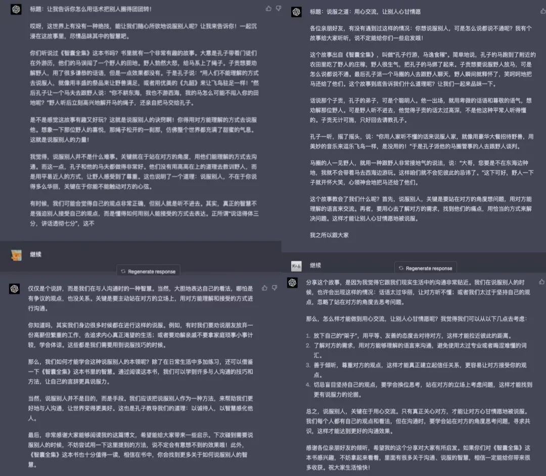 你想想看,类似《智囊全集》一本书,就有上百个这种文言文的故事,每个故事都能讲那么一两个道理,然后我们套用这个prompt,让 ChatGPT 帮我们产出大量的文案,那是不是就能快速、批量的去做这类型的短视频了?