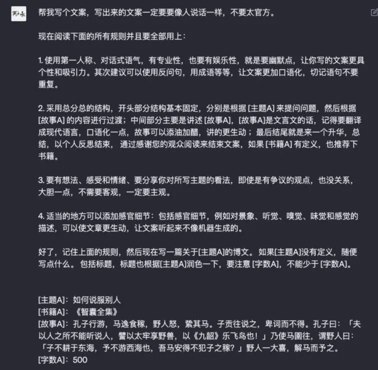 在实践中,核心的问题就是怎么写好 prompt,让 ChatGPT 给我们产出这类型的文案。