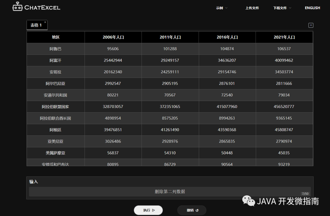 如上图所⽰:世界各国的⼈⼝表,如果你需要删除某⼀列,输⼊:删除第 N 列 然后就被删除了~,⽬前 ChatExcel 开放的 demo 完全免费。⽆需注册,上传⾃⼰的表格即可在线处理!但是毕竟是上传到公网的,数据安全性有待考察,自己使用时还需注意隐私!