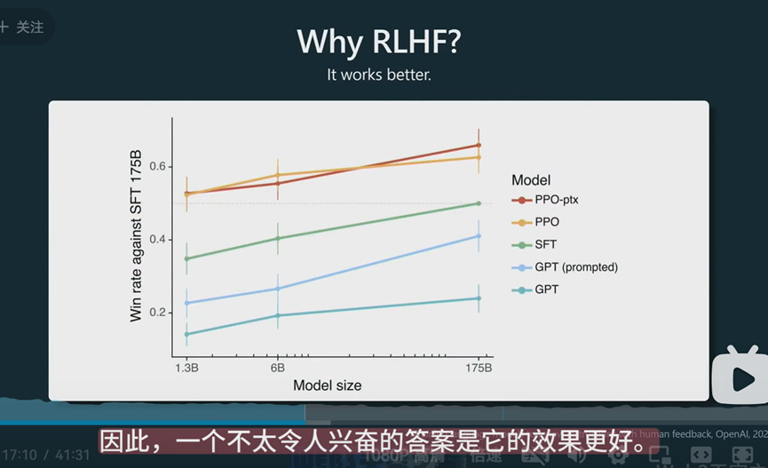 RLHF模型会比其它没有完整接受这四个阶段的模型效果要好。至于为什么要好,演讲者给出了他的猜测: