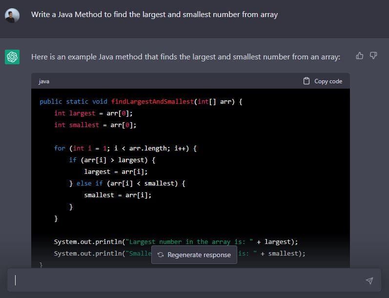因此,如果您想要 Java 代码查找最大和最小数字,那么您可以使用 ChatGPT 中的命令“编写Java 方法从数组中查找最大和最小数字”,它将为您提供代码解释。