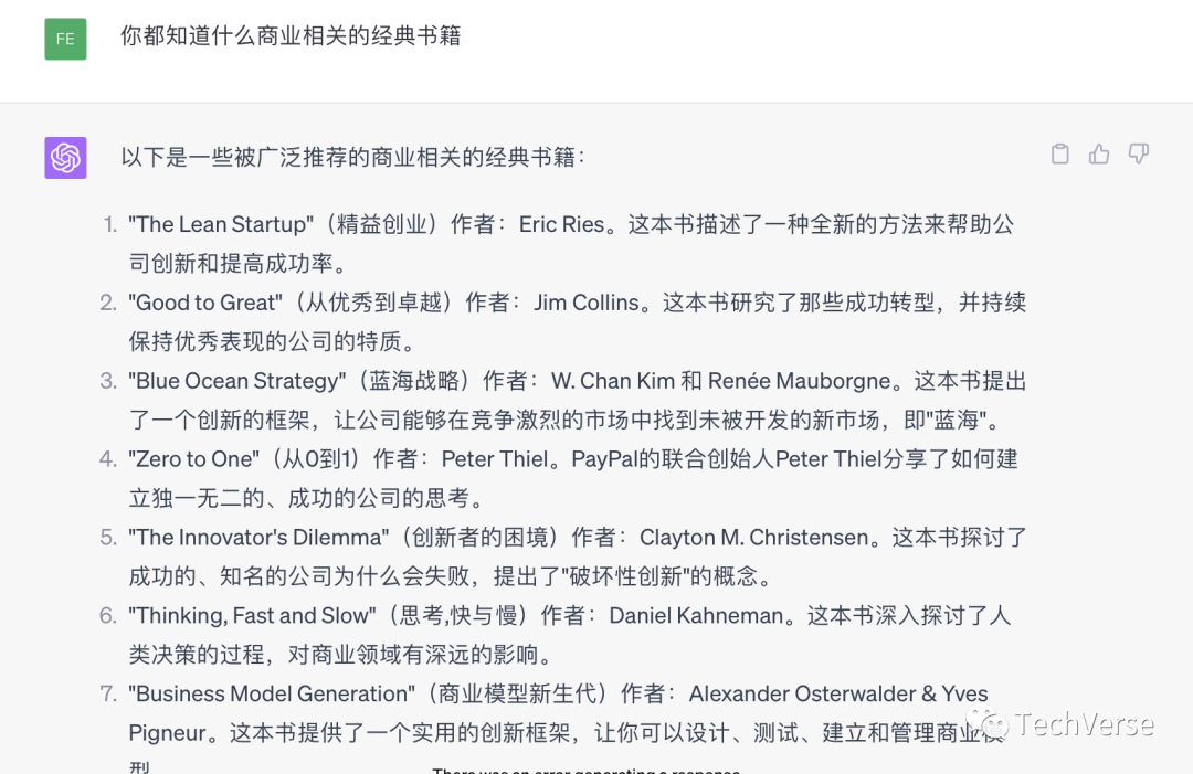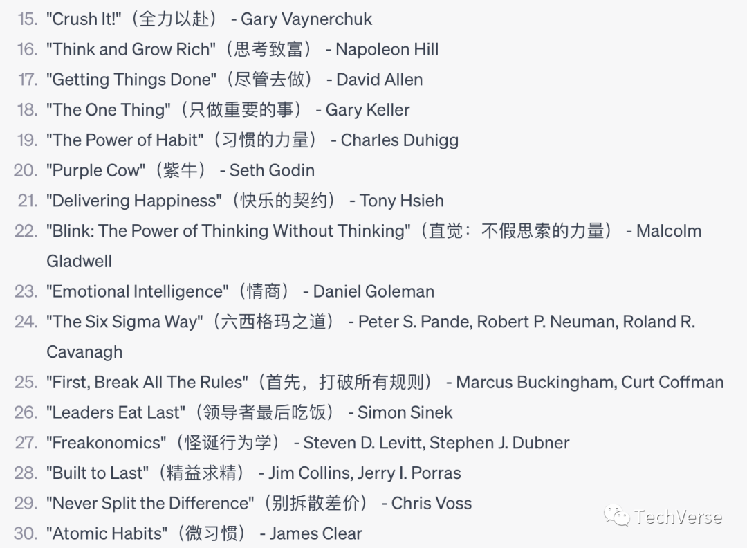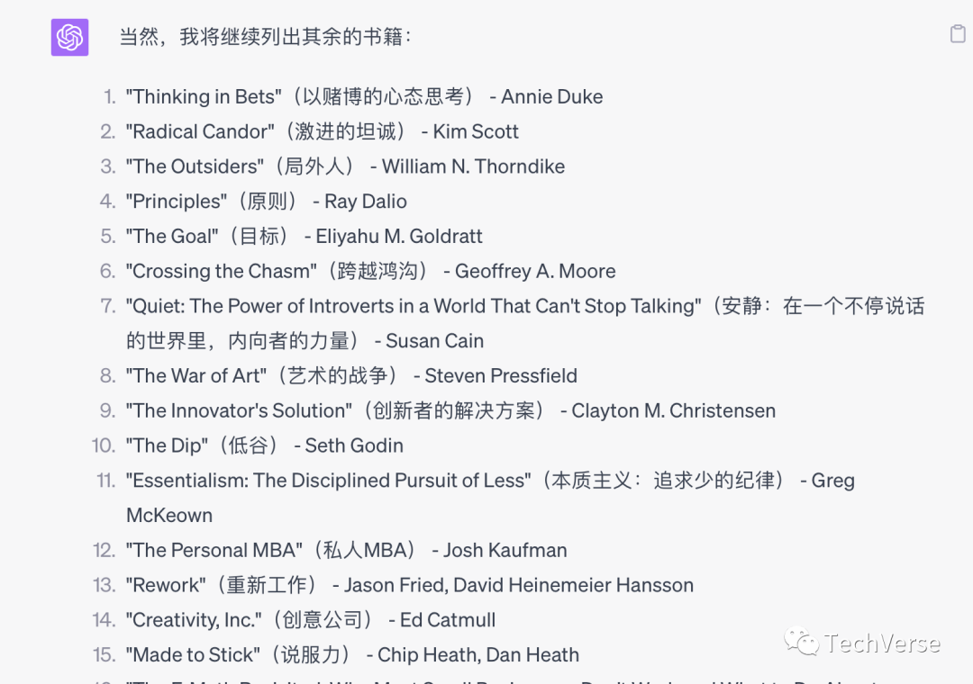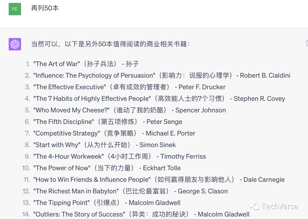 考虑到ChatGPT的模型时间,可以推测,模型在训练时应该已经学习过一些经典书籍的内容,到底学没学过,或者说ChatGPT知道什么书,我们只需要问一问: