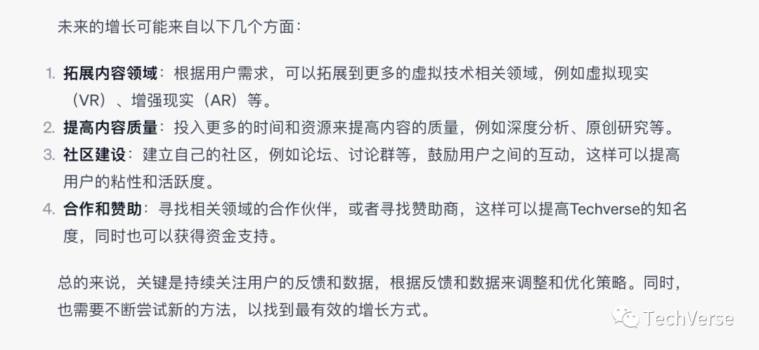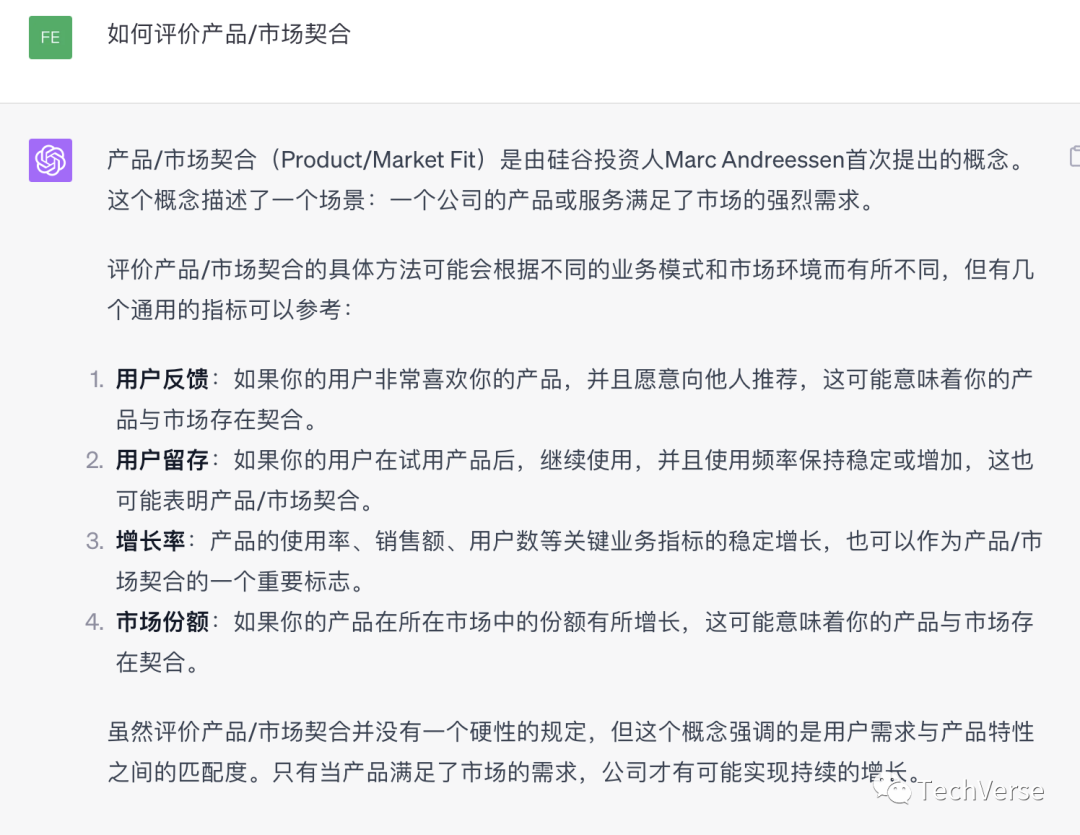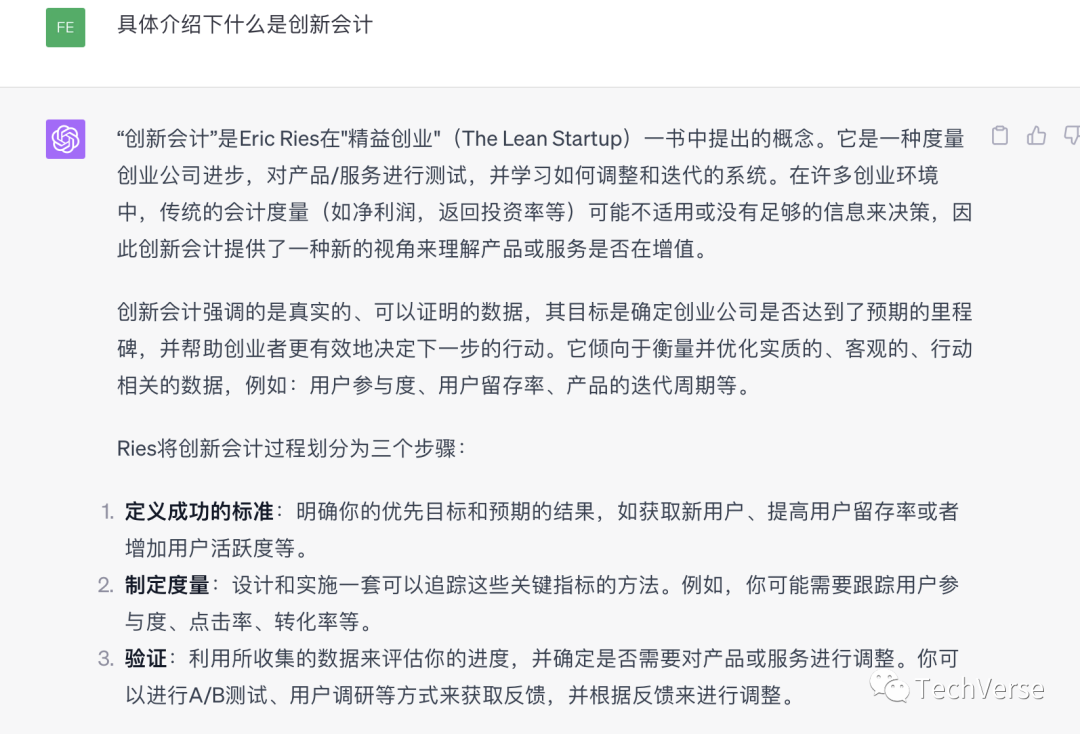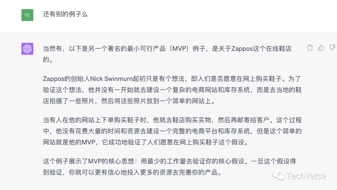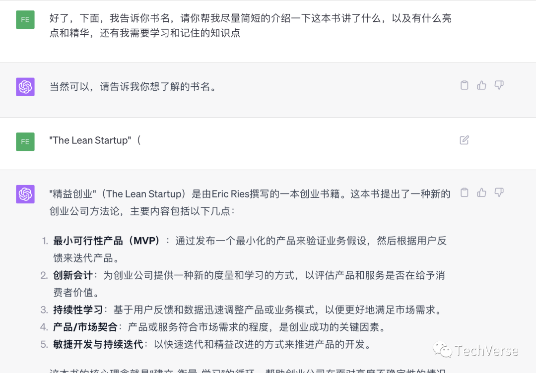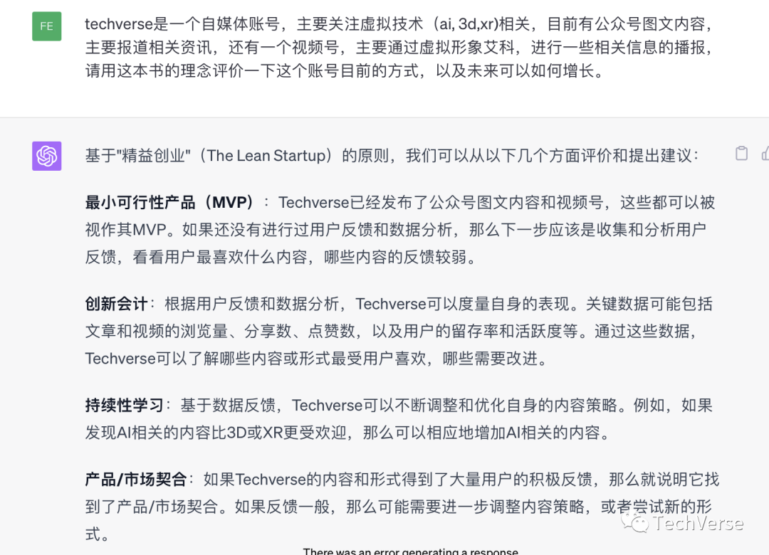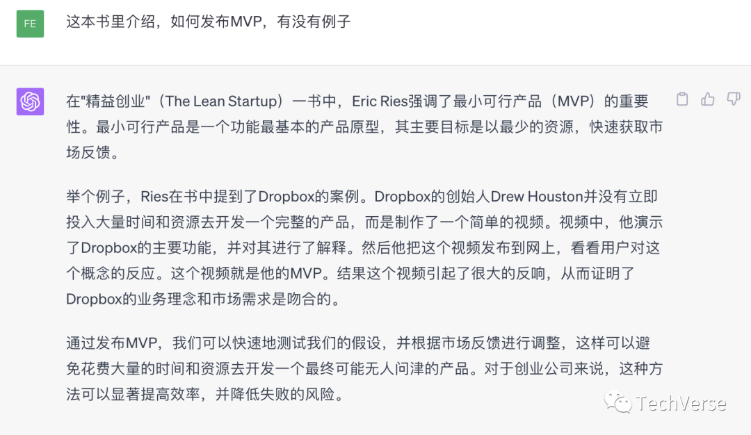 更深入的,还可以让ChatGPT举一反三,根据书本的内容去解决现实生活中的问题,比如,按照精益创业的原则帮TechVerse把把脉: