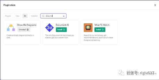 在“Plugin store”中,输入“show me”进行搜索,如图,找到“Show Me Diagrams”,单击“install”。因为我已经安装过了,所以这里是“Uninstall”。