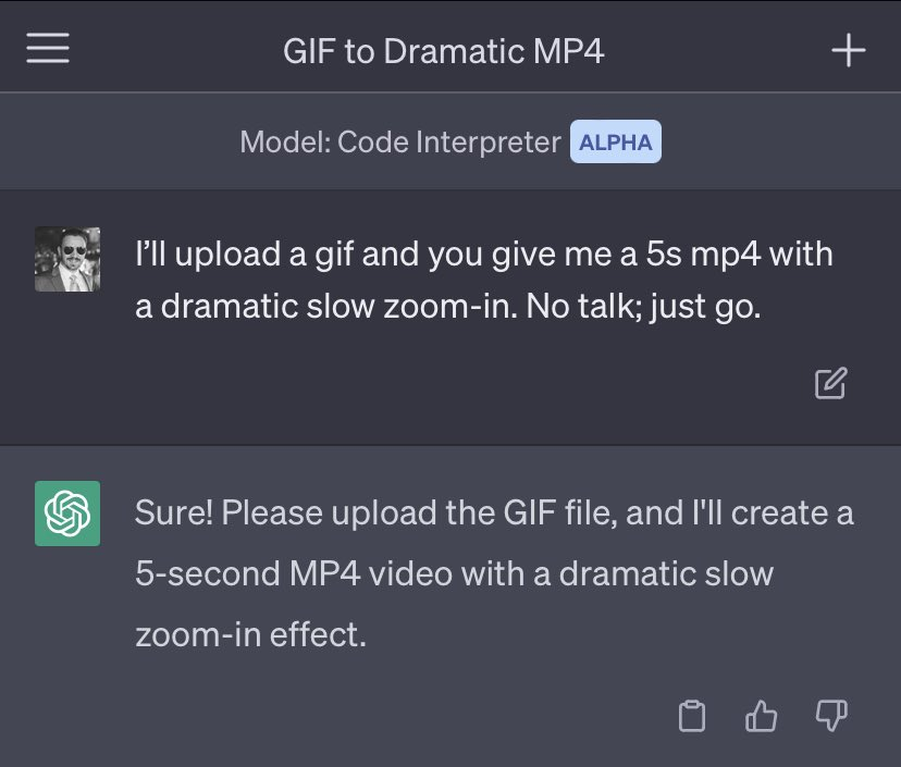 网友给ChatGPT的提示为:我上传一个GIF,你给我一个5s的MP4,用一个故事性镜头缓慢放大。
