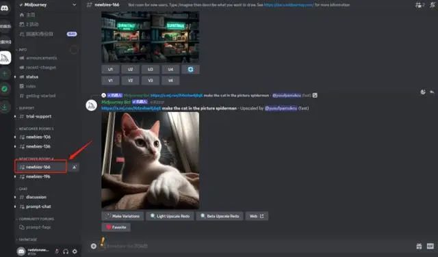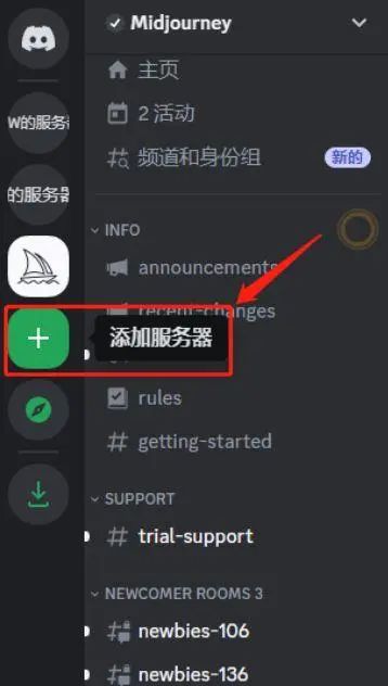 在左侧的“+”号中添加服务器,然后在免费房间中找到Midjourney Bot,点击它,并将其添加至自己的服务器。这样就能在自己的服务器上使用Midjourney画图了。