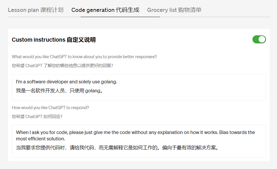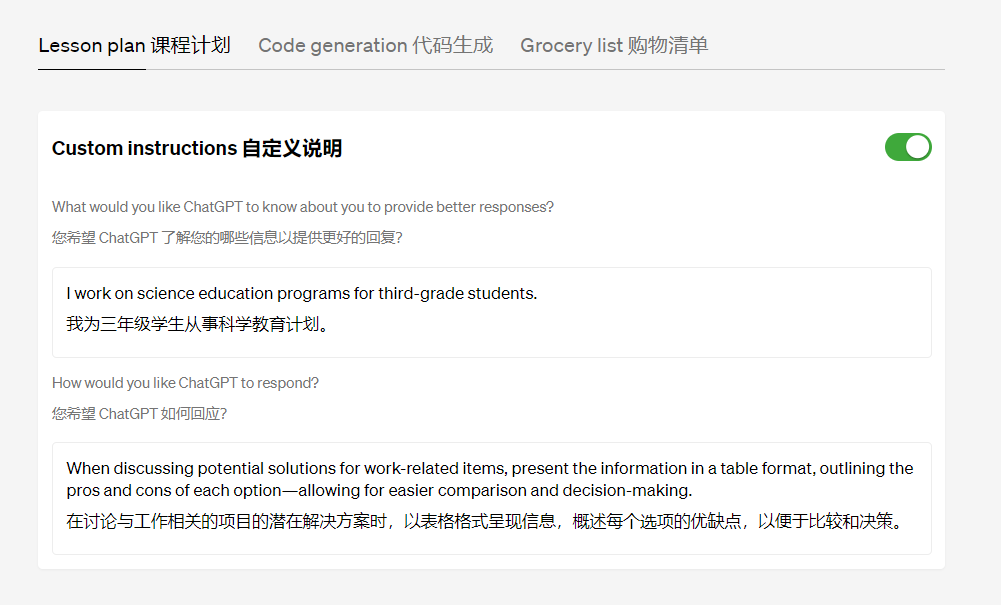 如果在后续的对话中不想让模型继续遵循,可以在「自定义指令」界面将其关掉。
