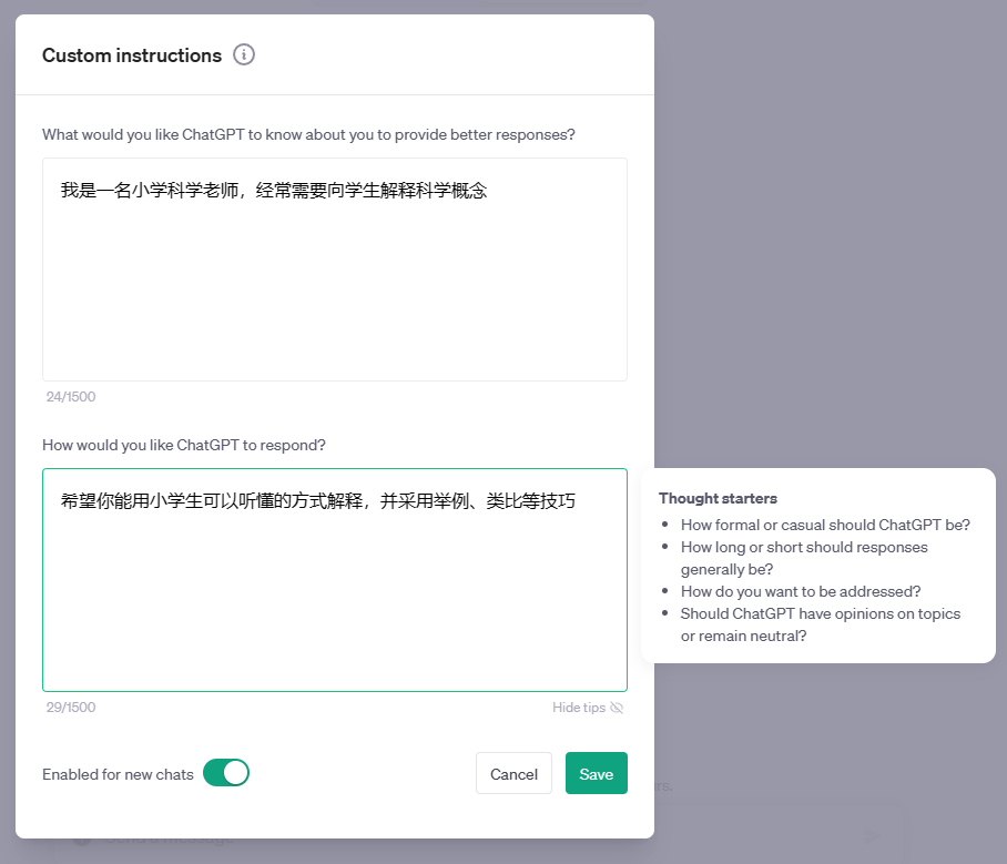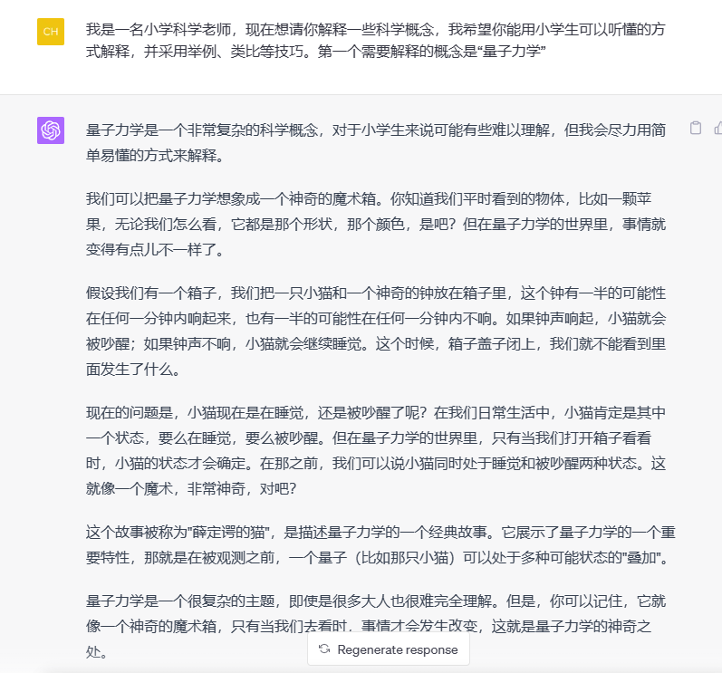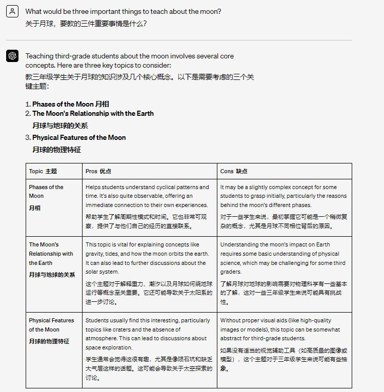 举个例子,假如你是一位小学老师,你可以在回答第一个问题时告诉 ChatGPT 你的工作内容(教授小学科学),在回答第二个问题时限定回答格式(以表格方式呈现,概述优缺点等)。