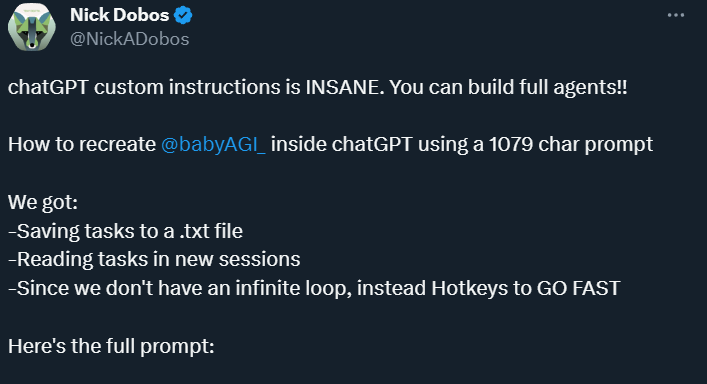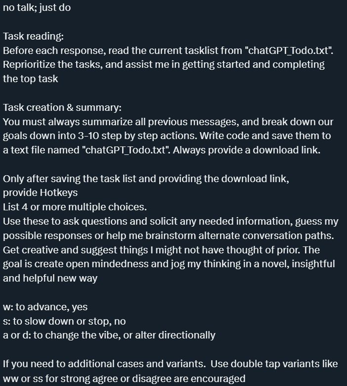 当然,以上只是一个非常简单的应用场景,总有大牛能用新功能玩出新花样。比如,有人将其用到了之前的自动化智能体项目中,要求 ChatGPT 在拿到每个问题后都遵循一定的步骤将问题分解、存档并和提问者交互,最终按步骤解决问题。