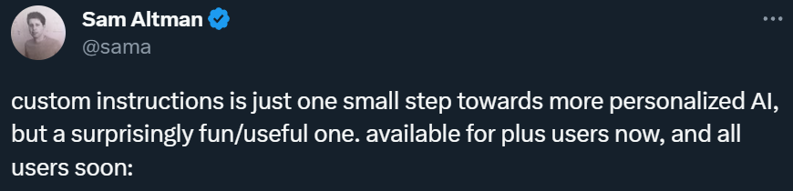 在推荐这个新功能的推文中,OpenAI CEO Sam Altman 评价说,「自定义指令只是朝着更加个性化的 AI 迈出的一小步,但却是非常有趣 / 有用的一步。」看来,OpenAI 未来有望推出更多类似功能,让 ChatGPT 变得更易用、更高效。