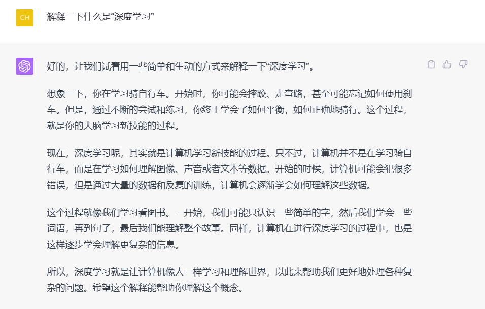 然后,我们尝试让 ChatGPT 解释一下什么是「深度学习」。结果显示,ChatGPT 确实遵循了我们预定义的指令。