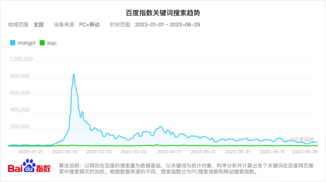 ChatGPT在2022年11月底推出,在2023年2月份,国内关注度飙升,搜索量整体环比增长2880%。