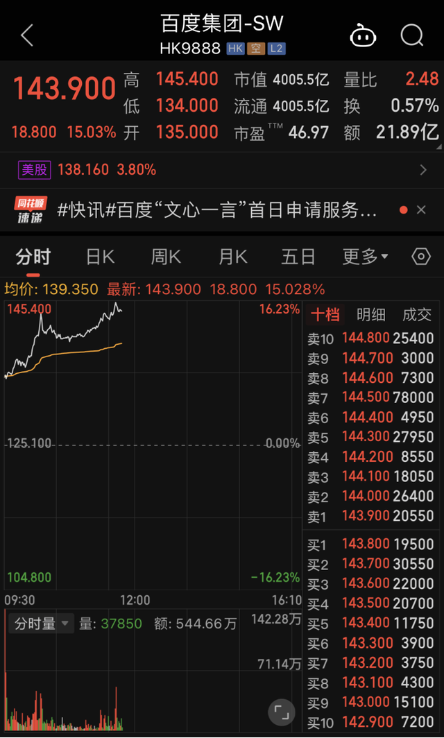 面对刚刚出世的文心一言,资本市场也颇显失望,百度港股股价一度下跌10%至120.1港元。过去一夜后,外界的态度却已开始分化甚至逆转,17日盘中百度股价涨幅逾15%。