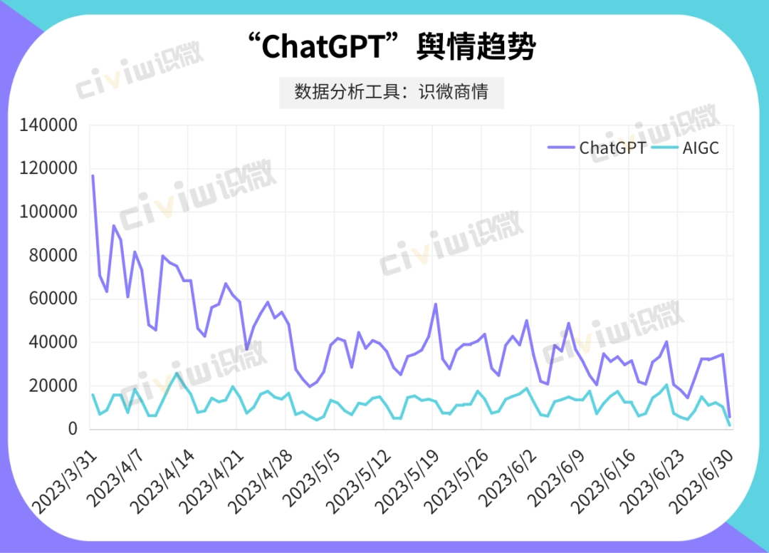 根据识微商情舆情监测系统(点击文末左下角阅读原文可免费体验系统)显示,近三个月来,ChatGPT相关网络热度呈逐渐降低的趋势,相关信息量394万。相对来说AIGC的热度比较平稳,相关信息量109万。