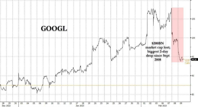 2023年2月9日,谷歌紧急推出全新AI聊天机器人Bard,结果发布会上Bard首秀翻车。在回答用户问题时给出了错误的答案,加剧了人们对其相关工具尚未准备好集成到搜索引擎中的担忧。其母公司Alphabet当日股价暴跌8%,市值蒸发约1000亿美元。同日,作为ChatGPT的受益方,微软早盘一度上涨3.4%,市值重回2万亿美元。