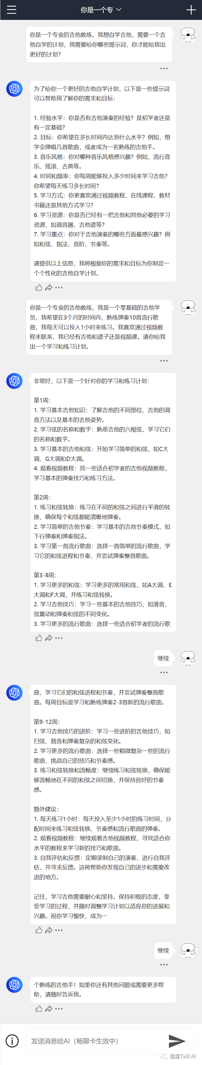 如果我想学习吉他,但是我不知道如何学起,但是如何才能让ChatGPT给我出一个较好的学习计划呢?类似的问题,我们也可以直接让ChatGPT帮我们来分析,完善我们的提示词。