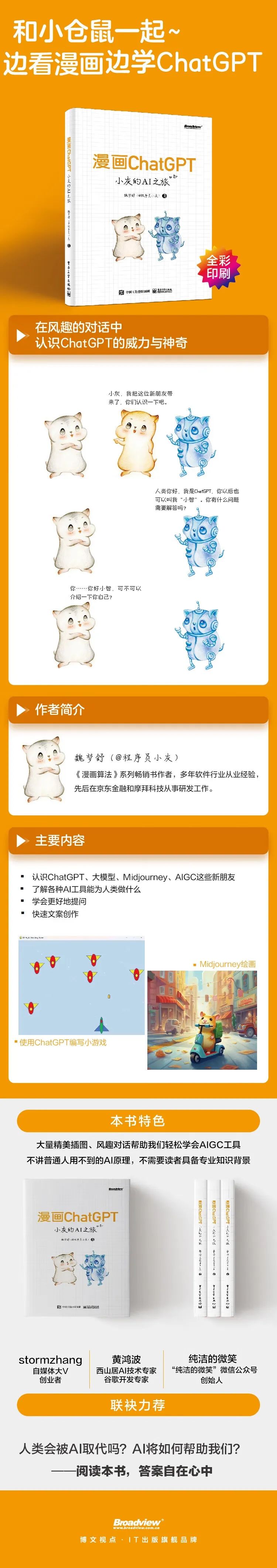 本书可谓值得人手一本的ChatGPT或AIGC的通识读本,从浅入深,从理论到实践,直观地认识ChatGPT的工作过程及使用场景,快来和一群快乐的小仓鼠一起感受ChatGPT的威力与神奇吧!