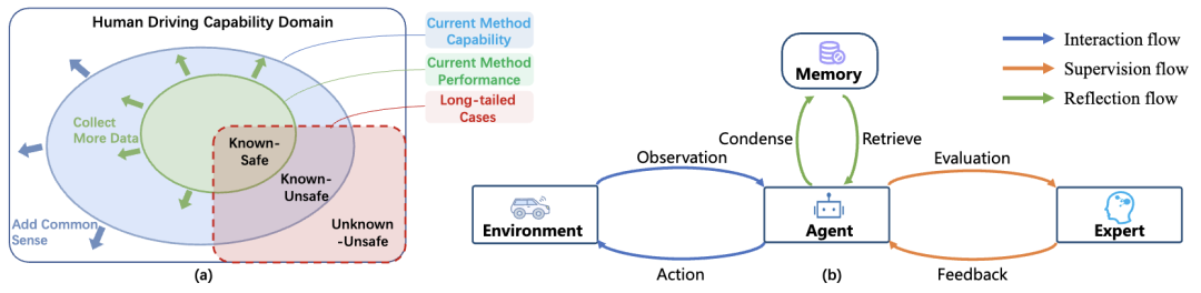 图1:(a) 人类驾驶与现有自动驾驶系统之间的关系,特别强调了当前方法的局限性以及为何它们无法解决所有长尾案例。(b) 一个可以像人类一样驾驶的系统的模式。该智能体可以探索和与环境互动,并根据专家的反馈进行自我反思,最终积累经验。