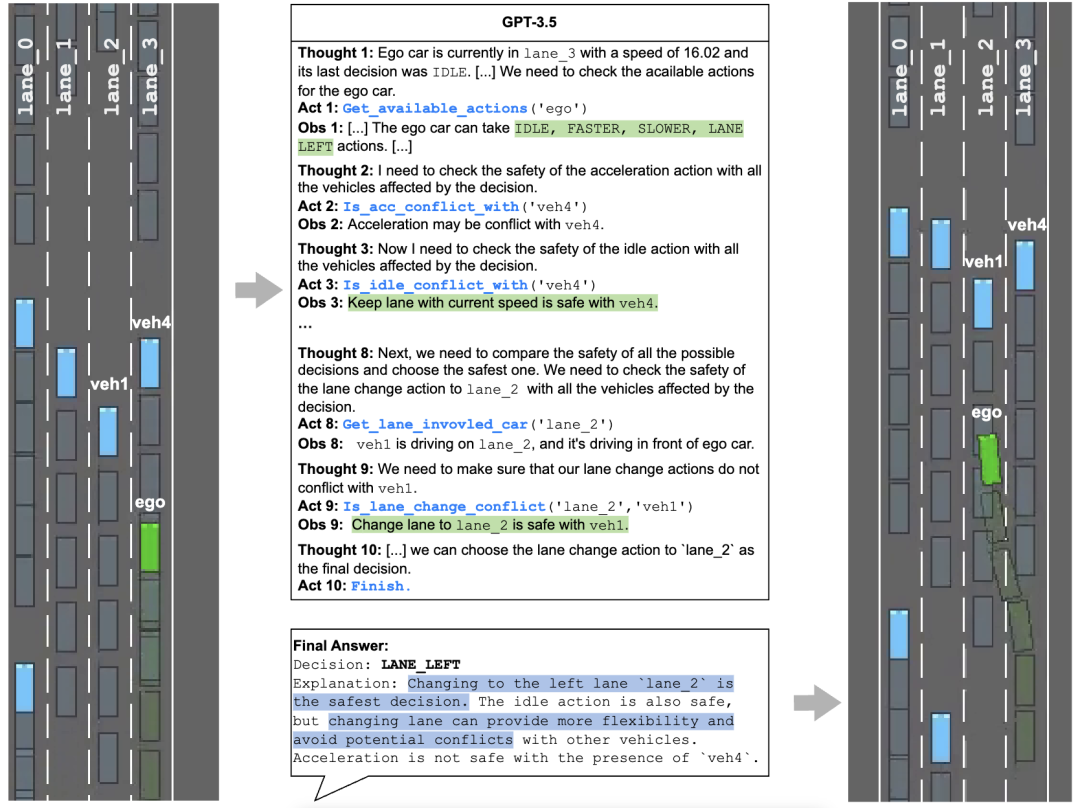 在图4这个例子中,绿色的车子在最右边的车道上,跟着车辆2并保持一定距离。之前,GPT-3.5判断前车距离太远,所以决定加速跟上车辆2。在开始ReAct过程时,GPT-3.5使用Get_available_action工具获取当前时间步骤的四个可用动作。然后它发现车辆2仍在前方行驶,而且空闲和加速两个动作都是安全的。GPT-3.5最终决定继续加速,因为它“选择与之前决策一致的动作”,就像最终答案中解释的那样。结果,车子缩短了与前车的距离,有助于整体交通流畅。与第一个例子相比,由于引用了之前的决策结果,GPT-3.5使用的工具数量和推理成本显著减少。