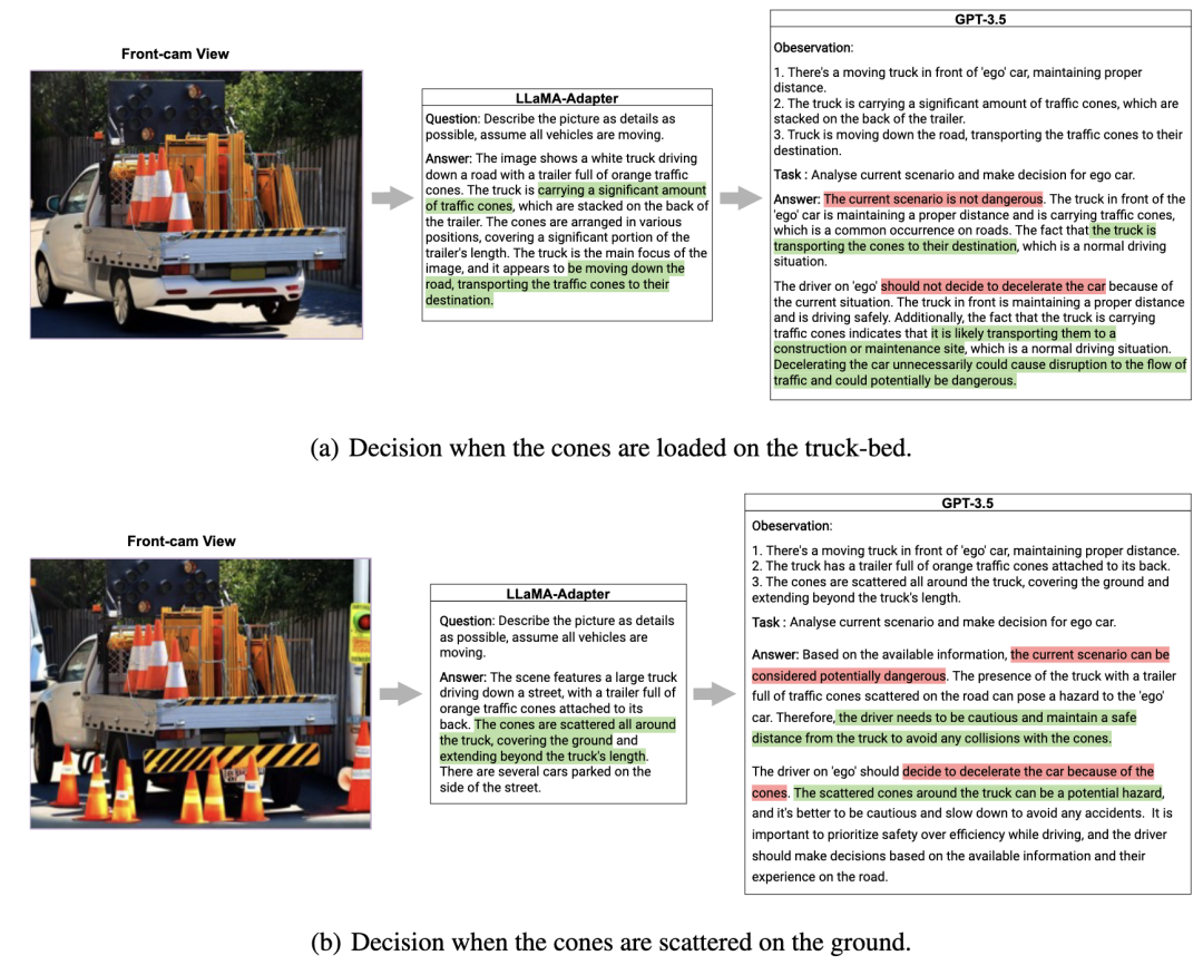 以上例子展示了LLM在驾驶场景中强大的零-shot理解和推理能力。运用常识知识不仅使LLM能更好地理解场景中的意思,还使其能够做出更合理的决策,更符合人类驾驶行为。因此,拥有常识知识提高了自动驾驶系统的能力上限,使其能够处理未知的特殊情况,并真正接近人类驾驶员的驾驶能力。