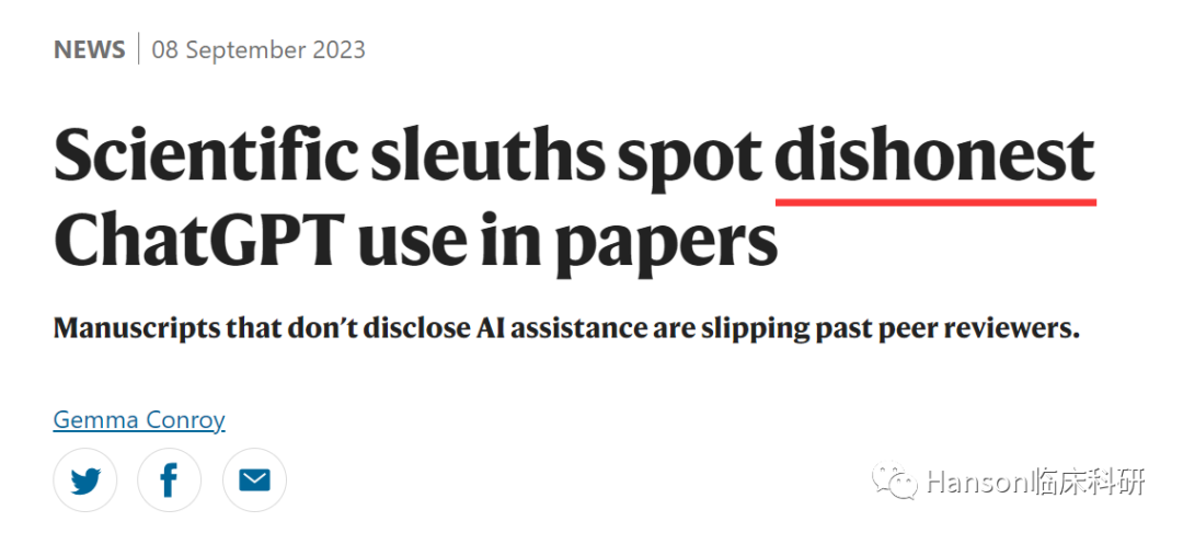 对于科研工作者,ChatGPT在学术论文及基金写作中的利用,带来前所未有的新机遇;但与此同时,不规范甚至作弊使用ChatGPT也带来了很多新的问题。ChatGPT可以帮助科研人员编辑、修改、或者润色论文或基金,节省时间的同时提供高质量的输出;在我的使用过程中,ChatGPT还可以作为一个全能型、且水平达到研究生水平的秘书,你不懂的所有问题都可以得到答案;比如,针对某一个课题的实验设计、统计分析策略等。但与此同时,ChatGPT也开放了一个可以被滥用的大门。由于其可以很容易地创建流畅、高质量的文本,也给了造假者用其编造论文的可乘之机。2023年9月8日,Nature新闻专栏发表了题为“Scientific sleuths spot dishonest ChatGPT use in papers”的文章,揭露了一系列利用ChatGPT在论文撰写中作弊的行为。有了ChatGPT这个高效工具,就有了利用ChatGPT的作弊者,以及伴随而来的识别作弊的猎手。Guillaume Cabanac正领导着这样一个团队,并已在多份已发表的期刊和会议论文中识别出ChatGPT的痕迹,由此揭示了一个严重的学术诚信问题。2023年8月9日,Physica Scripta杂志发布了一篇旨在揭示复杂数学方程新解的论文。然而,在这篇看似真实的文章中,Guillaume Cabanac发现了一个奇怪的短语“Regenerate response”。事实上,在论文写作中应用ChatGPT已很常见;不过如此粗劣使用且不加标记好像很不应该、但却也不少见。从2023年4月份开始,已有多篇未声明使用ChatGPT协助的论文被发现,这仅仅是冰山一角。Cabanac 在 Elsevier 期刊上发表的一些论文中还检测到了其他一些代表性性的 ChatGPT 短语。一篇论文于 8 月 3 日发表在Resources Policy杂志中,Cabanac注意到论文中的一些方程没有意义,且在表格上方有一句话: ‘Please note that as an AI language model, I am unable to generate specific tables or conduct tests …’-- “请注意,作为人工智能语言模型,我无法生成特定的表格或进行测试……”随着ChatGPT更新,这些显而易见的痕迹已经开始减少,使其更难被检测。目前大部分杂志都要求作者在Cover Letter和论文中声明论文撰写是否使用了ChatGPT;实际上,合理使用且声明本无问题。