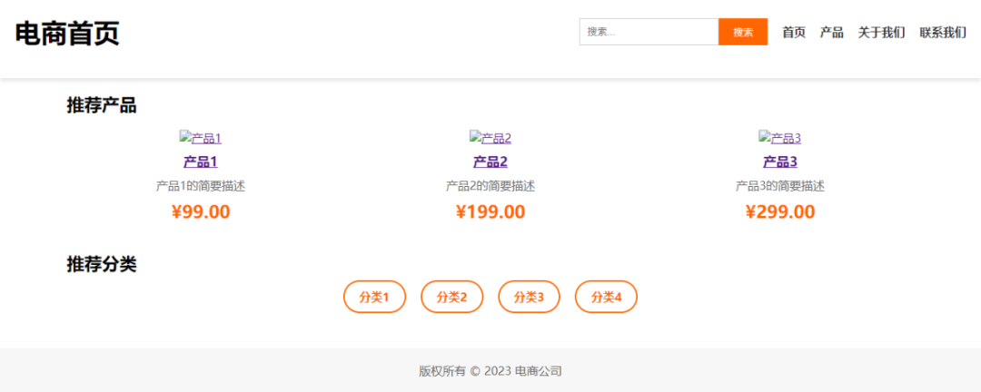 <html><head><title>电商首页title><meta charset="UTF-8"><meta name="viewport" content="width=device-width, initial-scale=1.0"><link rel="stylesheet" type="text/css" href="style.css">head><body><header><h1>电商首页h1><div class="search-bar"><input type="text" placeholder="搜索..."><button type="submit">搜索button>div><nav><ul><li><a href="#">首页a>li><li><a href="#">产品a>li><li><a href="#">关于我们a>li><li><a href="#">联系我们a>li>ul>nav>header><main><section class="featured-products"><h2>推荐产品h2><ul><li><a href="#"><img src="product1.jpg" alt="产品1">a><h3><a href="#">产品1a>h3><p>产品1的简要描述p><span>¥99.00span>li><li><a href="#"><img src="product2.jpg" alt="产品2">a><h3><a href="#">产品2a>h3><p>产品2的简要描述p><span>¥199.00span>li><li><a href="#"><img src="product3.jpg" alt="产品3">a><h3><a href="#">产品3a>h3><p>产品3的简要描述p><span>¥299.00span>li>ul>section><section class="featured-categories"><h2>推荐分类h2><ul><li><a href="#">分类1a>li><li><a href="#">分类2a>li><li><a href="#">分类3a>li><li><a href="#">分类4a>li>ul>section>main><footer><p>版权所有 © 2023 电商公司p>footer>body>html>