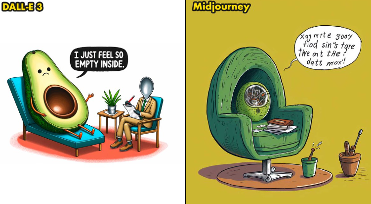 首先是很经典的牛油果看病梗图,提示词:一个牛油果坐在治疗师的椅子上,说着 “ 我感到内心如此空虚 ” ,牛油果中间有一个小坑大小的洞。治疗师,勺子,涂鸦笔记。