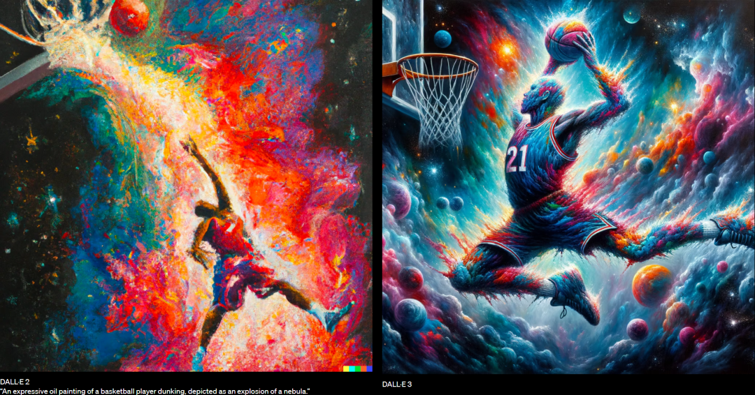 就比如让它们画篮球运动员扣篮的场景,元素是星空爆炸。