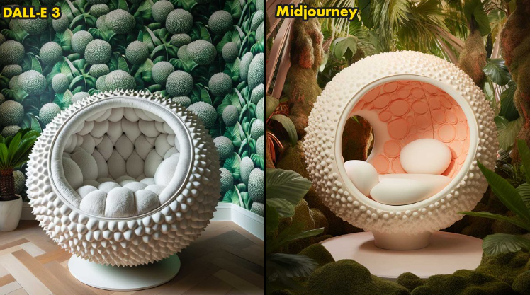 再来一张以荔枝为灵感的球形椅子的照片,细节上,要求有白色凹凸不平的外观,柔软的内饰,与背后的热带壁纸形成对比。