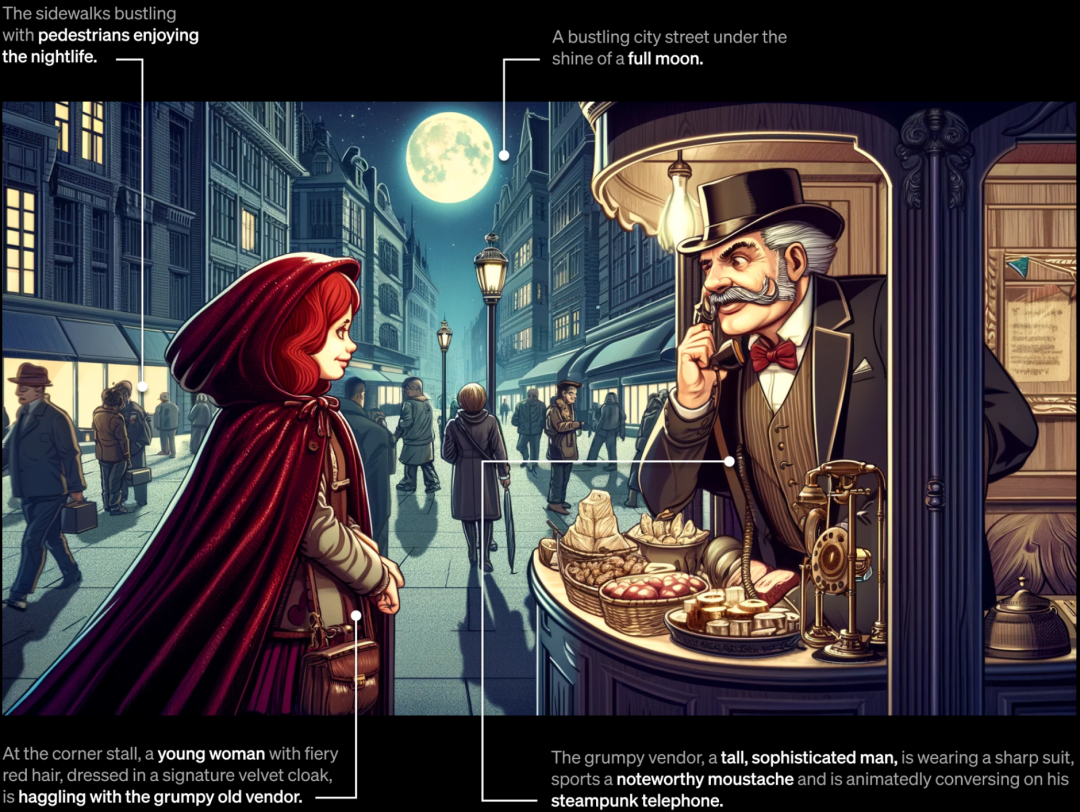 升级版的 ChatGPT 不仅不会丢失关键信息点,就算只是零零星星打了几个关键词,它也能帮你自动补全描述,然后再让 DALL·E 3 生成图片。
