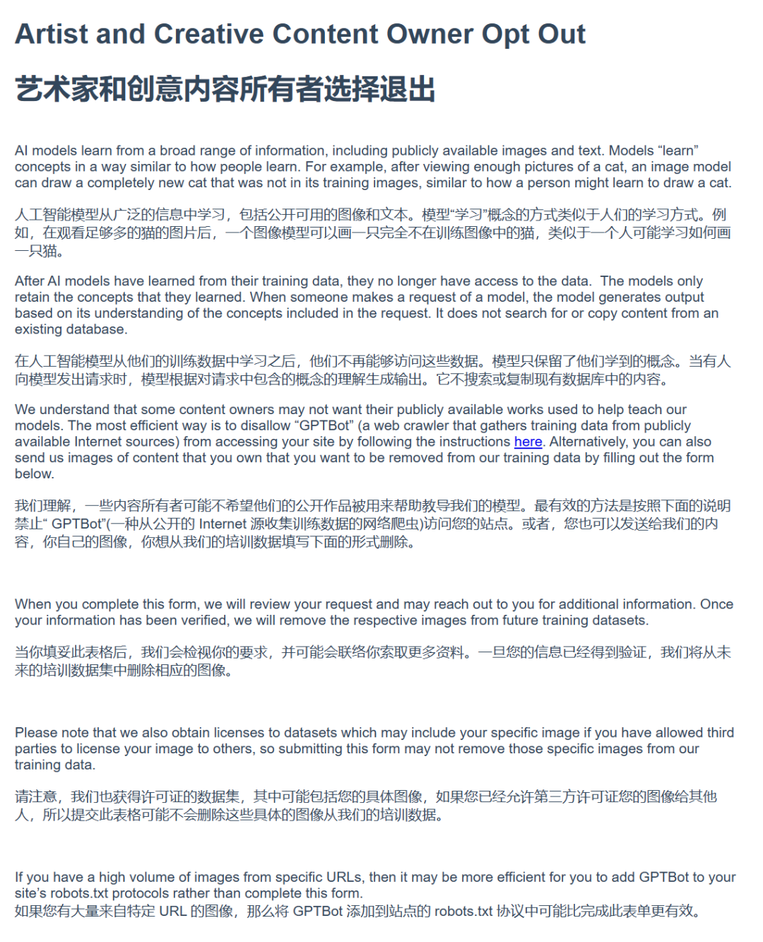 不过,有了太多的前车之鉴, OpenAI 这次耍了点小聪明,说是艺术家可以选择拒绝自己的作品被投喂给 DALL·E ,前提是只要填一个表格就 OK 了。