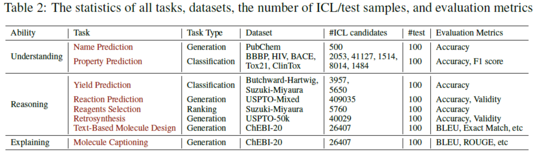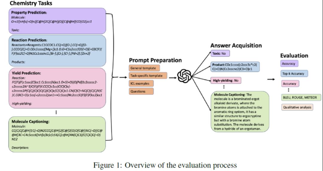 本文的研主要究集中在8个实际的化学任务上,主要包括:1)名称预测,2)性质预测,3)产率预测,4)反应预测,5)逆转录合成(从产物中预测反应物),6)基于文本的分子设计,7)分子概括,8)试剂选择。本文分析借鉴了广泛可用的数据集,包括BBBP、Tox21、PubChem、USPTO、ChEBI等。通过精心选择的提示样本和特定提示,在零样本和少样本的情景学习中,对每个化学任务评估了三个GPT模型(GPT-4、GPT-3.5和Davinci-003)。