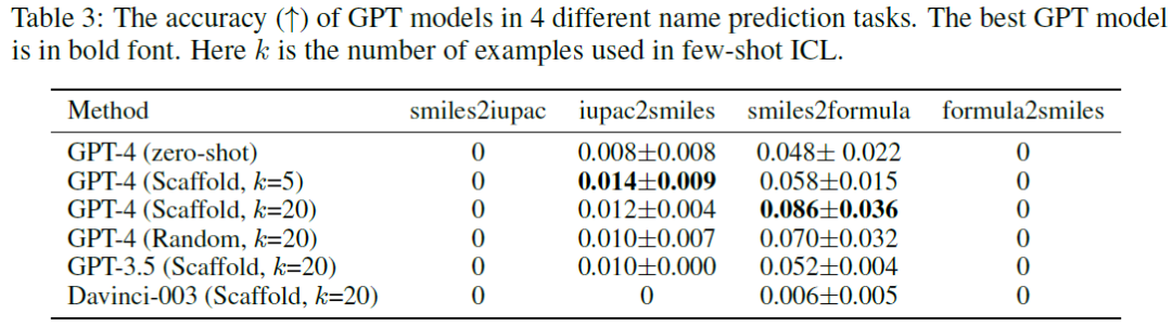 结果如表3所示(只报告了具有代表性的方法及其通过验证集上的网格搜索进行的最佳提示设置)。在所有四个名称预测任务中,最佳方法的准确度都极低(在iupac2smiles任务中为0.014,在smiles2formula任务中为0.086),甚至为0(在smiles2iupac和formula2smile任务中)。这表明GPT模型缺乏基本的化学名称理解能力。Davinci-003的精度明显低于其他型号 。