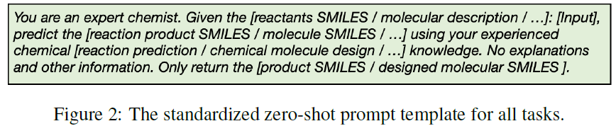对于每个任务,应用一个标准化的零样本提示模板。如图2所示,指示GPT模型以化学家的身份发挥作用。框架内的内容针对每项任务进行定制,以适应其特定的输入和输出。GPT模型的响应仅限于返回所需的输出。