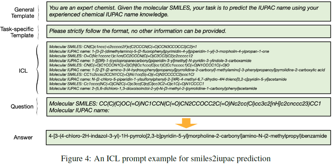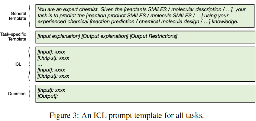 ICL是GPT模型的一种使用方式,其预测是基于提供的示例 。本文特别将ICL定义为一种少样本的情景学习方法。为了全面检查GPT模型在每个特定化学任务中的能力,设计了一个特定任务的ICL提示模板。如图3所示。