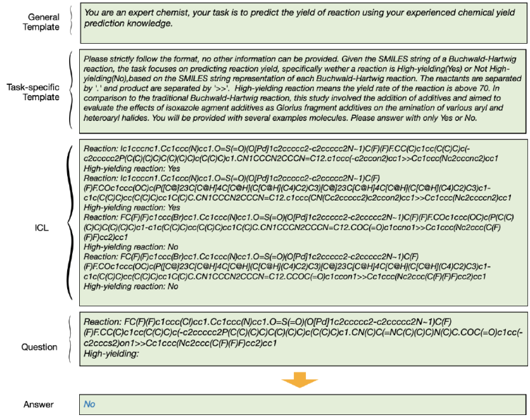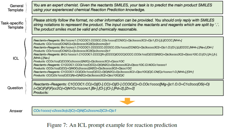 用Butchward Hartwig数据集的一个例子展示了的ICL产量预测提示。如图6所示,结合了一个输入解释(其中反应器用“.”分隔,产品用“>>”分隔)来帮助大型语言模型。此外,还强制执行输出限制,以确保生成有效的结果。