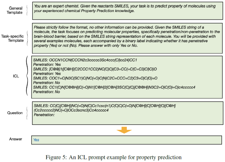 图5展示了用于属性预测的ICL提示的示例。在任务特定模板中,详细解释了预测血液屏障穿透的任务,以帮助GPT模型理解BBBP数据集的输入SMILES。此外,为输出建立了一定的约束条件,以符合属性预测任务的特定特征。