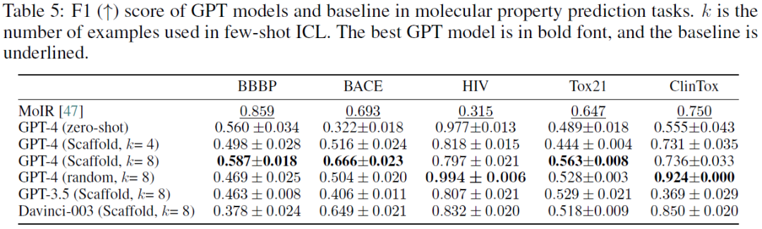 结果在表5中以F1表示,准确度在表6中。观察到,在4/5 (2/5)的数据集上,GPT模型在F1方面优于基线模型。在所检查的GPT-4模型范围内,GPT-4在预测分子性质方面超过了Davinci-003和GPT-3.5。在的研究中,发现有样本的情景学习(ICL)会显著提高模型性能。这表明ICL的数据量与模型的预测精度之间的直接关系。同时,的研究提供了经验证据,证明基于scaffold相似性筛选的性能在三个不同的数据集(BBBP、BACE、Tox21)上超过了随机采样的性能。对此的一个合理解释可能是样本骨架分子和查询分子之间的结构具有一定的相似,这可能会使GPT模型偏向于更准确的决策。