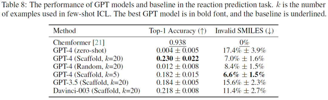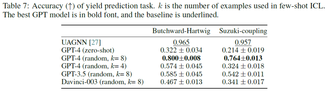 结果如表7所示。的分析表明,在产量预测任务中,GPT模型的表现低于已建立的基线模型UAGNN。然而,值得注意的是,UAGNN模型是在包括数千个例子的完整训练数据集上训练的。相对于其三个模型,GPT-4是具有更优的性能,在预测反应产率方面盖过了Davinci-003和GPT-3.5。在的研究过程中,发现了ICL可以提高模型性能。这表明ICL数据的数量与所考虑的模型的预测准确性之间存在固有的相关性。这种现象在GPT-4的情况下尤为明显,当ICL实例的数量从4个增加到8个时,观察到性能的显著改善,无论是在Butchward-Hartwig还是Suzukicoupling反应中。这表明,即使在相同的模型架构中,提示示例的数据的数量也会显著影响预测能力。