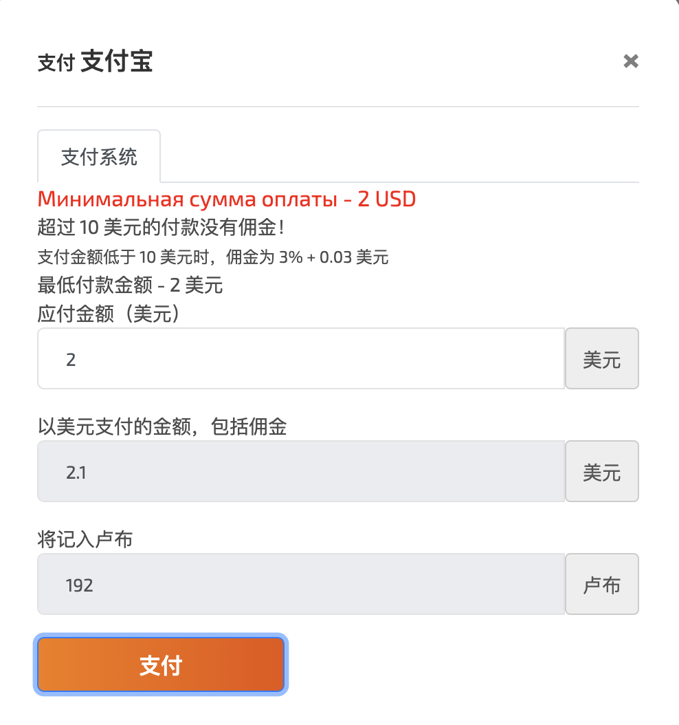 接码OpenAi的一次费用是大概11卢布,折算人民币差不多是1块钱。可以选择支付宝,不过只能充美金,页面提示最低充值2美金: