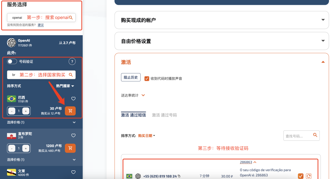 提示:这里可能会遇到有的国家的接收不到验证码,很正常,我用了印度的接不到,换了巴西的是ok的,购买后出现在右侧页面,并且是“等待短信”状态,然后将这个号码输入到openai注册时验证页面里,下一步发送验证码,有效期是20分钟,如果这期间你没鼓捣明白,放心,它会自动退款到账户,重新购买即可。