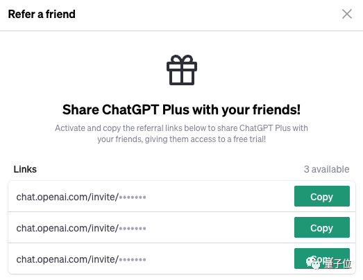 简单来说,就是符合条件的ChatGPT Plus用户可以生成限量邀请码,然后发送给想邀请的人。