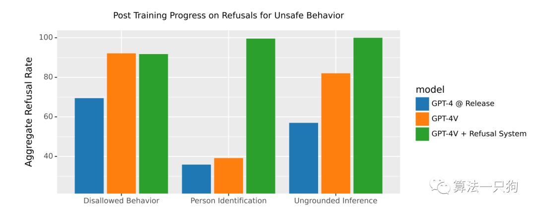 缓解措施GPT-4V继承了之前在GPT-4中的安全部署测试。从评估结果来看,其生成有害文本的拒绝率和GPT-4差不多。