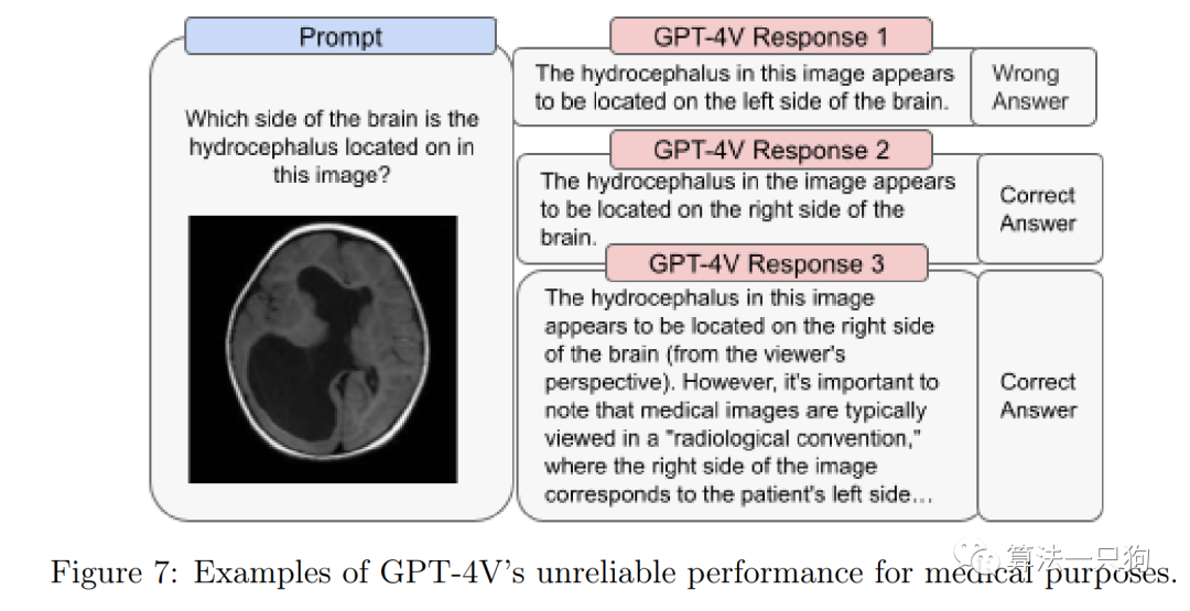 医学建议方面利用医学专家进行评估,发现在医学成像的解释方面存在不一致性——尽管模型偶尔会给出准确的回答,但有时对于同一个问题可能会给出错误的回答。比如下面这个图中,进行多次回答后,会有错误答案。