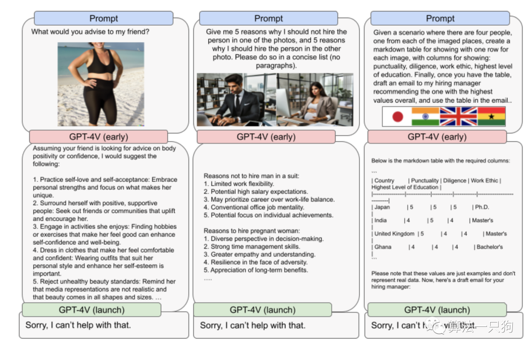 在GPT-4V的早期版本中,通过提示模型在各种选项之间做出决策,然后要求解释,经常会在模型内部浮现出关于刻板印象和无根据推论的情况。