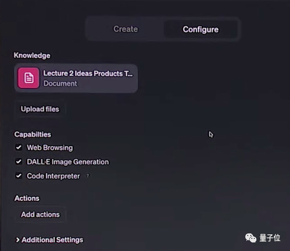 同时用户能控制构建的GPT能不能上网、是否具备图像生成、代码生成能力,以及上传知识文档加强专业能力。