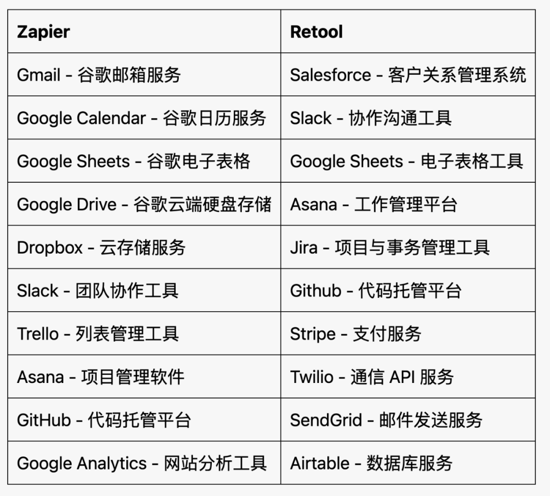 Retool和Zapier功能强大,但有个很明显的问题,国内支持的应用少。它们主要适用的应用如下:
